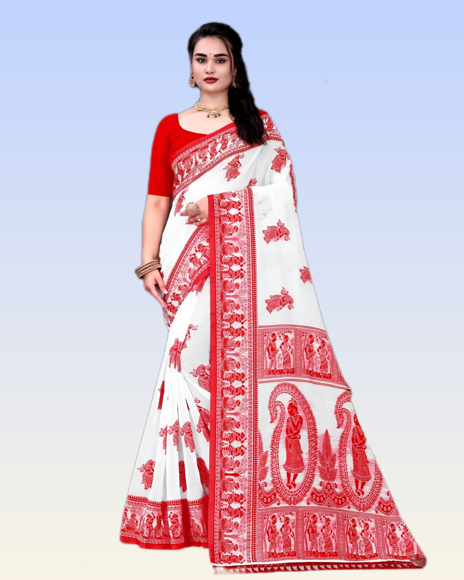 The white body is adorned with subtle red floral butta motifs, giving the saree a perfect balance of simplicity and artistry. Made from a soft silk-blend (cotton-silk-like) fabric, it offers smooth texture, lightweight comfort, and a graceful drape—ideal for long hours of wear during festivals, family gatherings, cultural events, or temple visits.