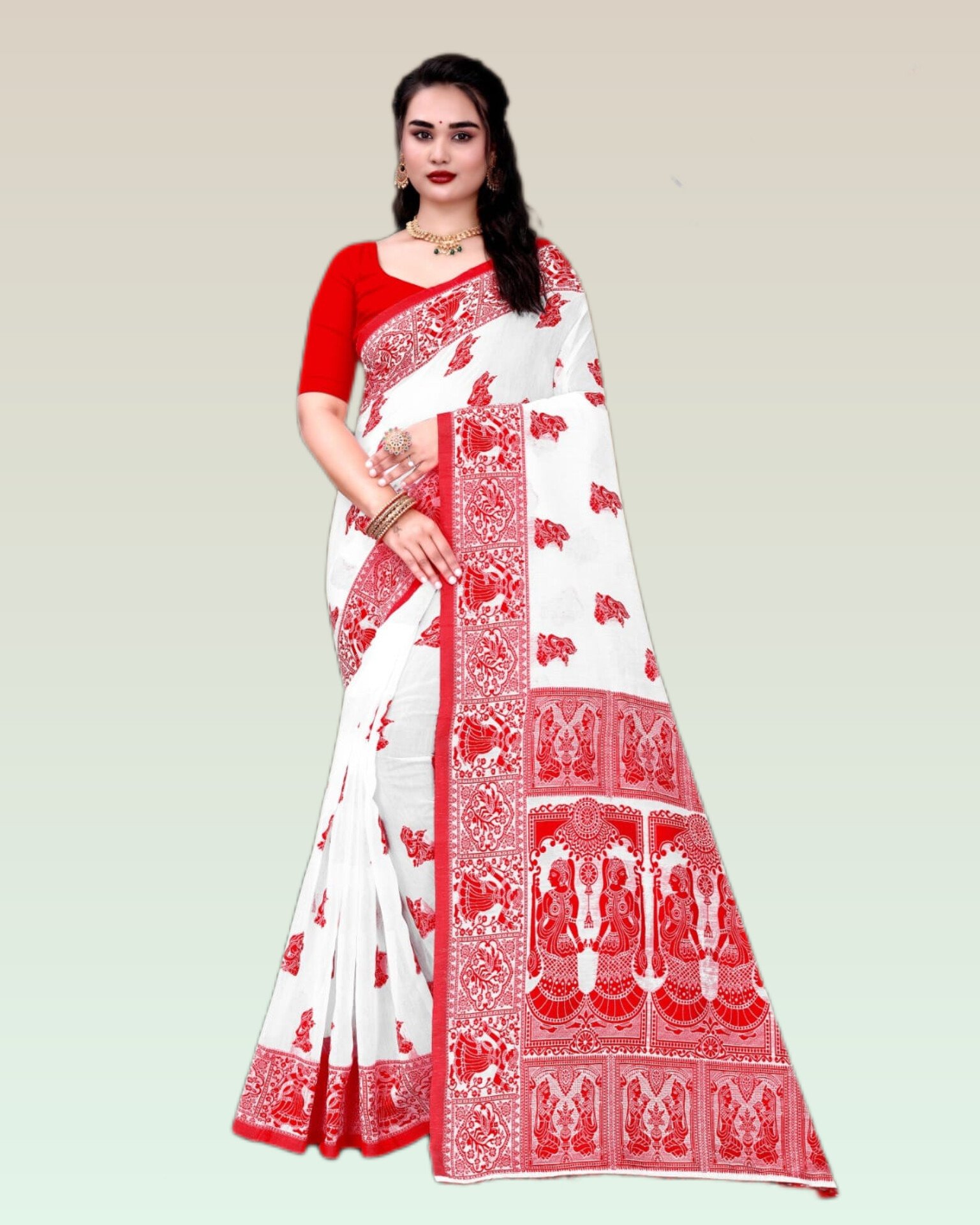 The saree features a white body adorned with delicate red woven butta motifs, creating a soothing yet eye-catching contrast. The highlight lies in its richly woven red border and pallu, intricately designed with traditional patterns inspired by flora and fauna. Each detail reflects fine craftsmanship, adding to the saree’s cultural and aesthetic appeal.